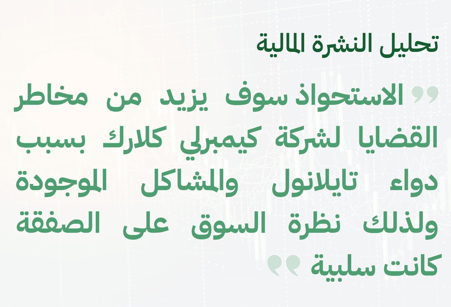 ما بعد اعلان الاستحواذ ارتفعت اسهم Kenvue ما يقارب 20% بينما اسهم شركة Kimberly Clark انخفضت 13% مما يبين ان السوق يرى مخاطرة في هذه الصفقة خاصة وان شركة Kenvue لديها صافي ديون بمقدار 8 مليار دولار وهذا سوف يضاعف حجم ديون كيمبرلي كلارك الحالي.