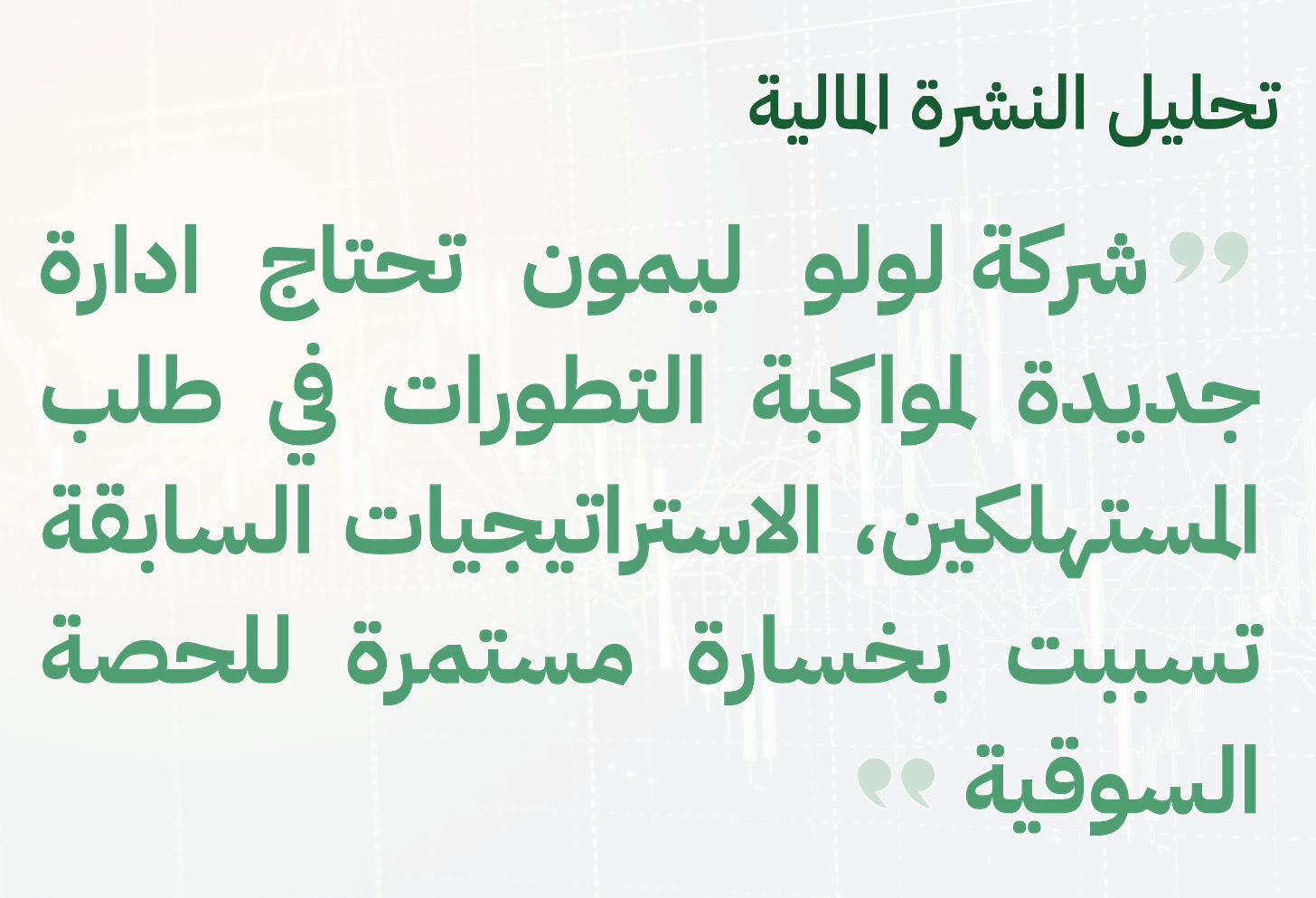 الرئيس التنفيذي لشركة لولو ليكون تنحى عن المنصب الاسبوع الماضي والشركة تواجه مشاكل في القطاع بسبب خسارة الحصة السوقية للمنافسين. اسهم شركة لولو ليمون انخفضت 44% منذ بداية العام وخلال اخر 5 سنوات أسهم الشركة منخفضة 40%.