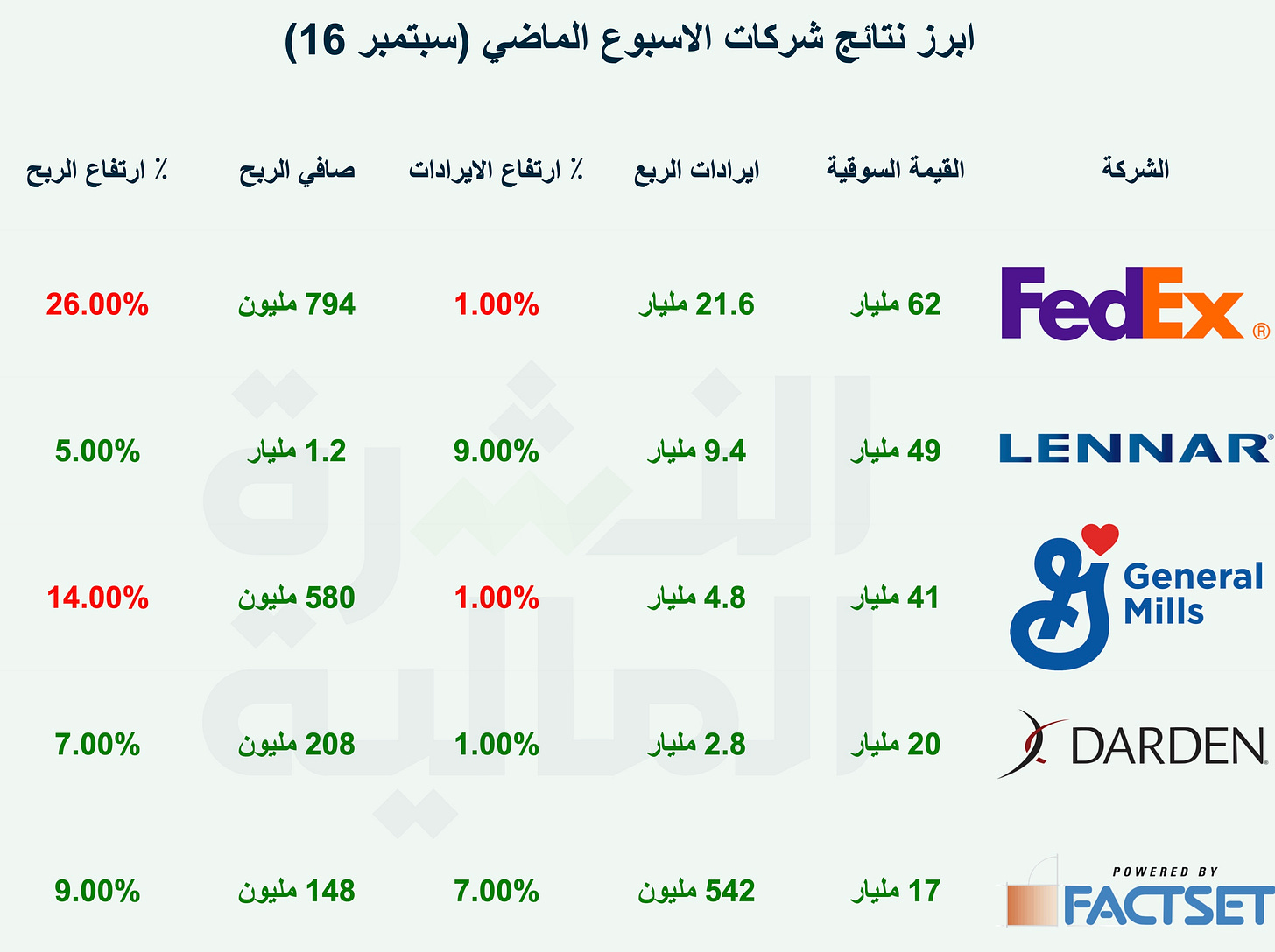 اسهم شركة فيديكس تنخفض 14% بعد نتائج اقل من التوقعات. الشركة سجلت إيرادات 21.6 مليار دولار مقابل توقعات 21.9 مليار دولار. صافي الربح كان 794 مليون دولارا وهو أقل بكثير من التوقعات